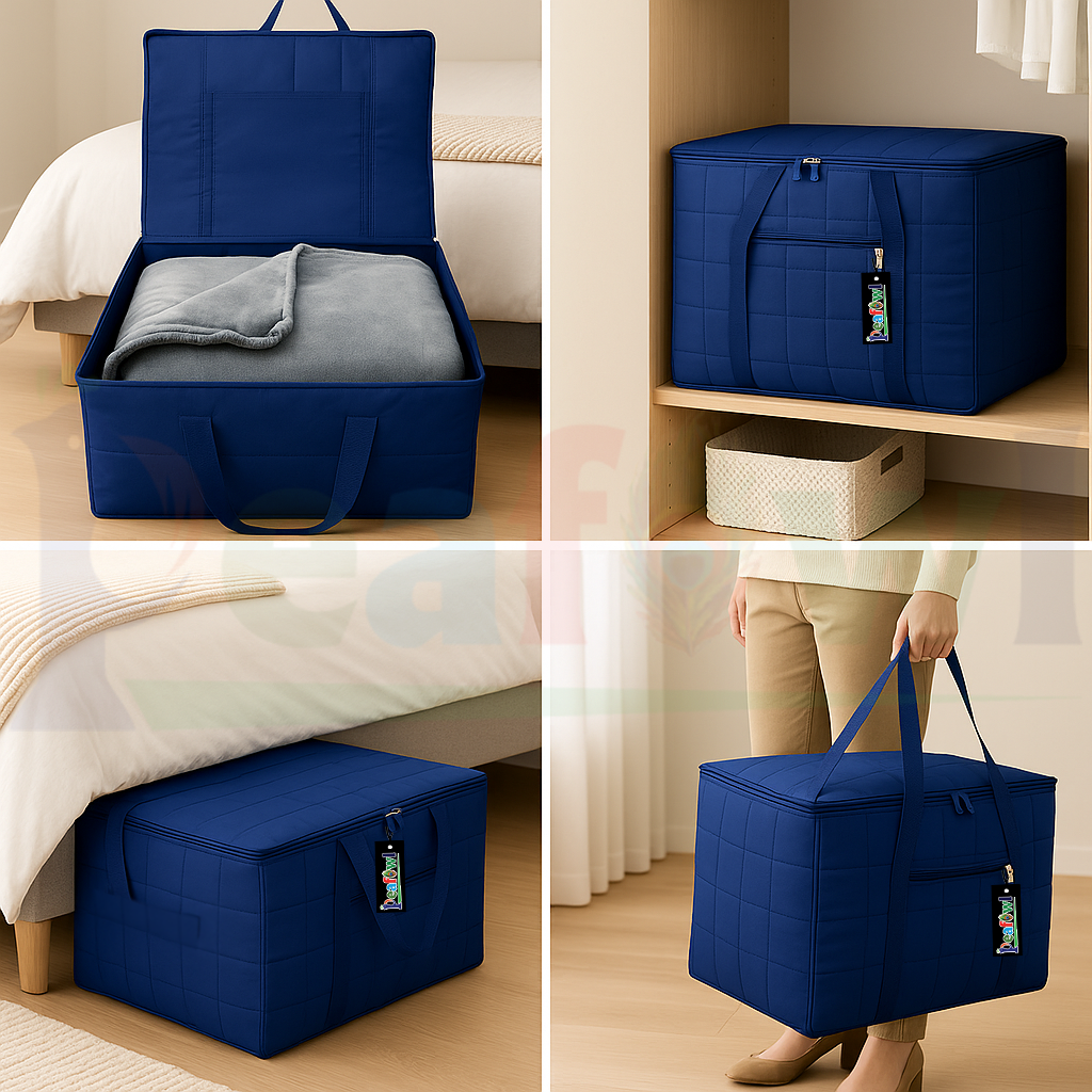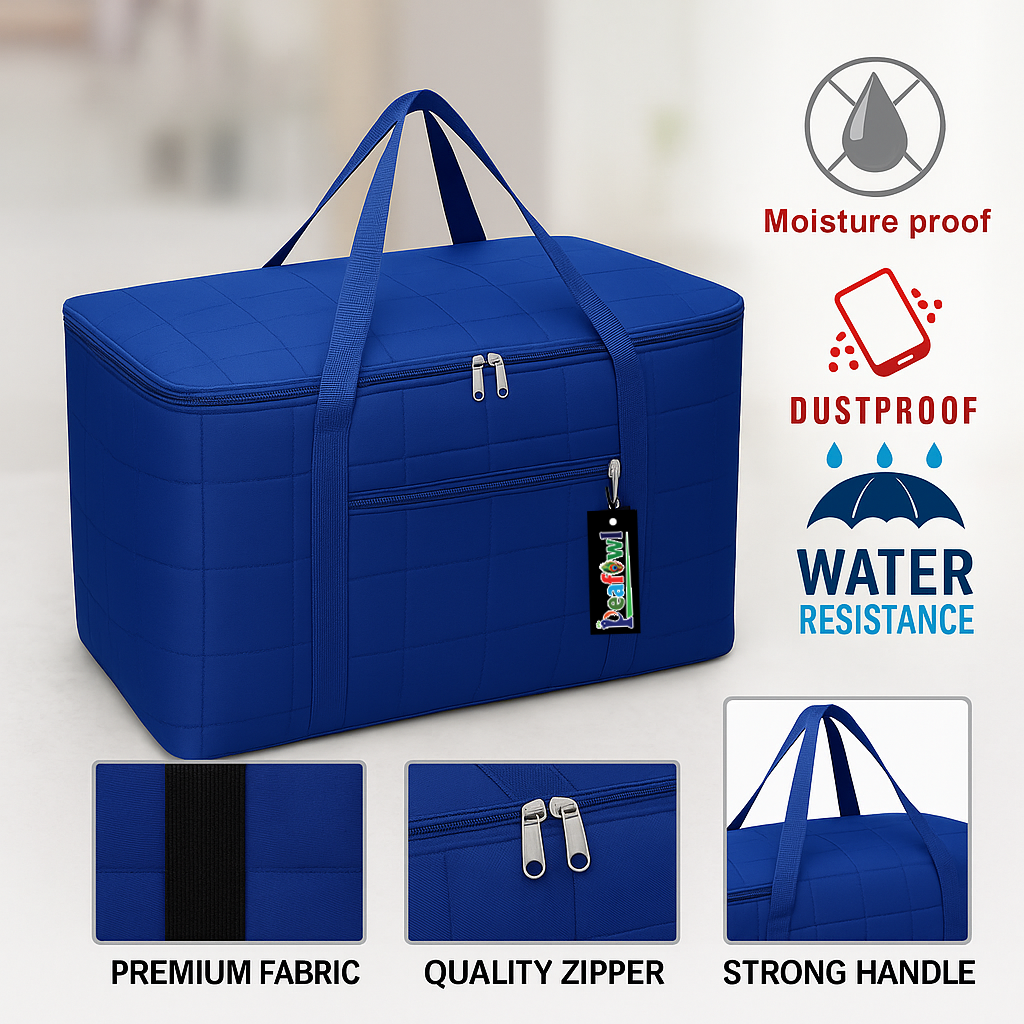 The Peafowl Double Bed Blanket Bag Cover offers an ideal solution for storing your valuables like double bed blankets, sarees, and more. Designed for practicality and durability, this jumbo-sized storage bag covers provide utmost protection against dust, dirt, and moisture while maintaining neat and organized storage. Made with water-proof and dust-proof material, your belongings remain safe, clean, and in great condition no matter where you choose to store them?be it your wardrobe, attic, or storage unit.